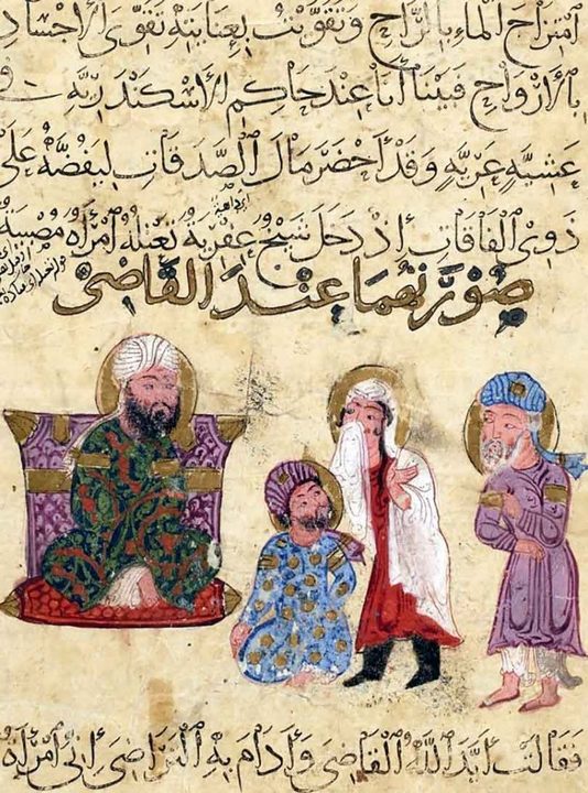 Illustration showing a qāḍī (judge) and litigants of “Maqāmāt al-Ḥarīrī.” Paris, Bibliothèque Nationale, arabe 3929, fol. 15v. 12th-13th c. CE.